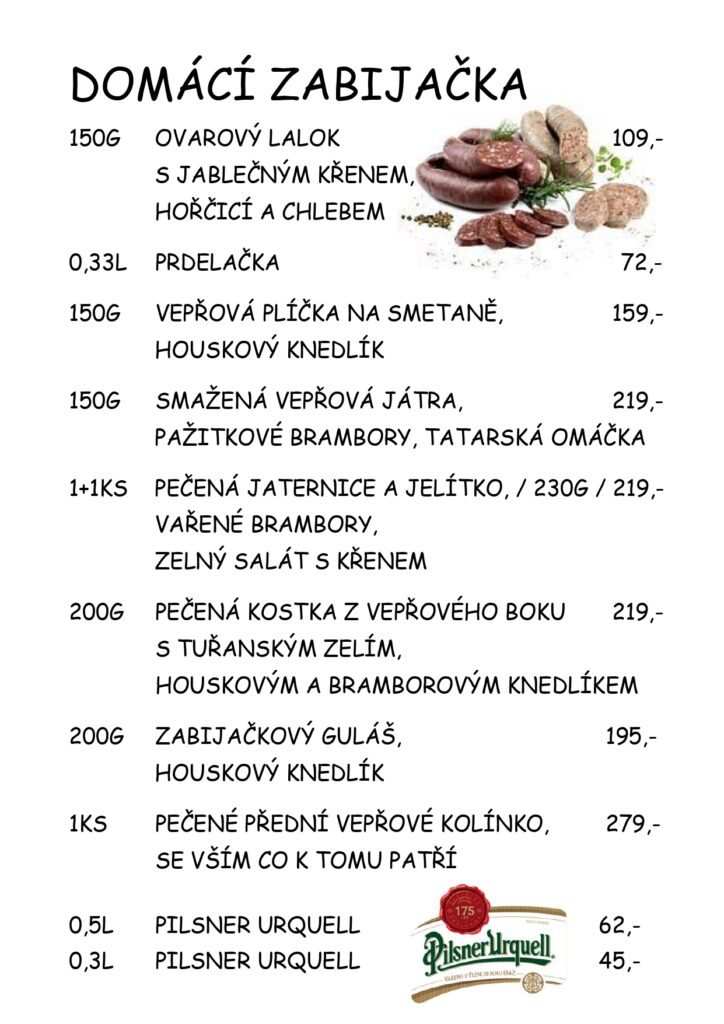 | 100 g | Domácí utopenec v kysaném nálevu, pečivo | 89 Kč |