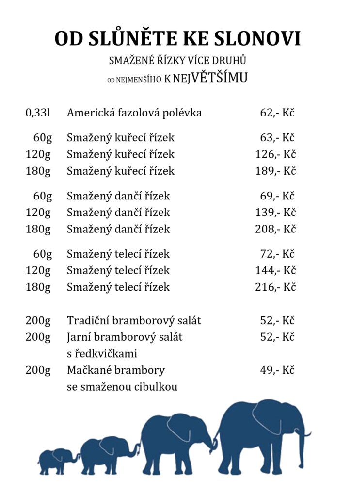 | 75 g | Smažený kuřecí řízek, příloha dle vlastního výběru | 125 Kč |